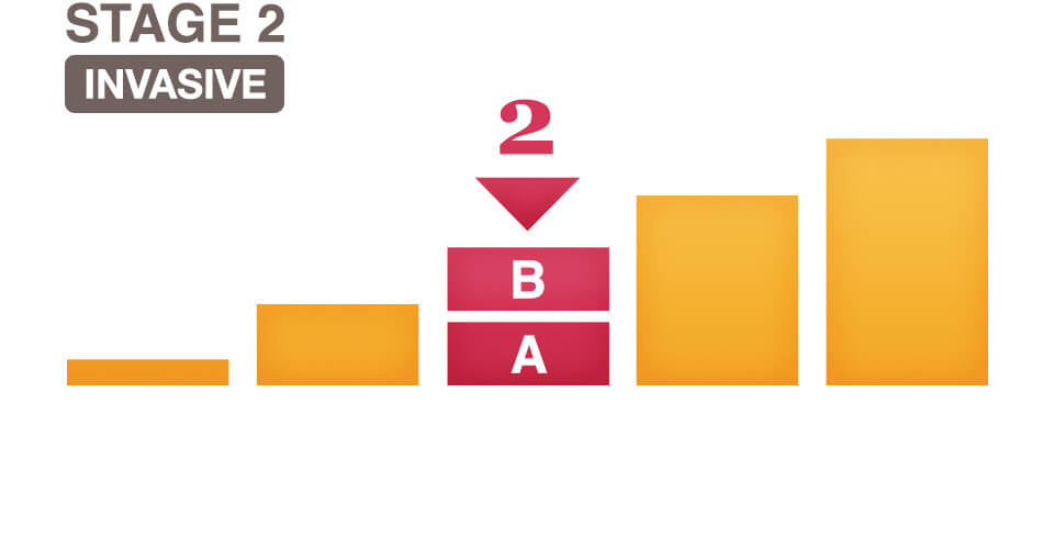 This stage is divided into groups: Stage 2A and Stage 2B. The difference is determined by the size of the tumor and whether the breast cancer has spread to the lymph nodes.