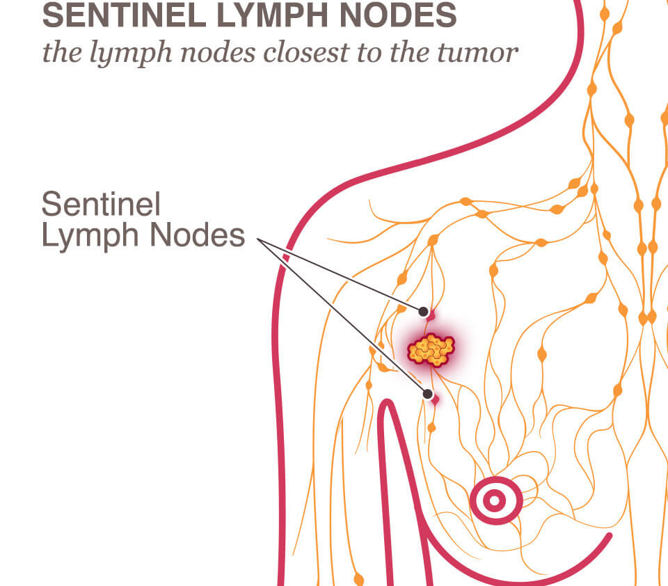 The sentinel lymph node (and in some cases there are several grouped together) is the first node “downstream” from the cancer in the lymph circulatory system. If the cancer were to travel away from the breast tumor and into the lymphatic system, this node would be the first one to show evidence of breast cancer.
