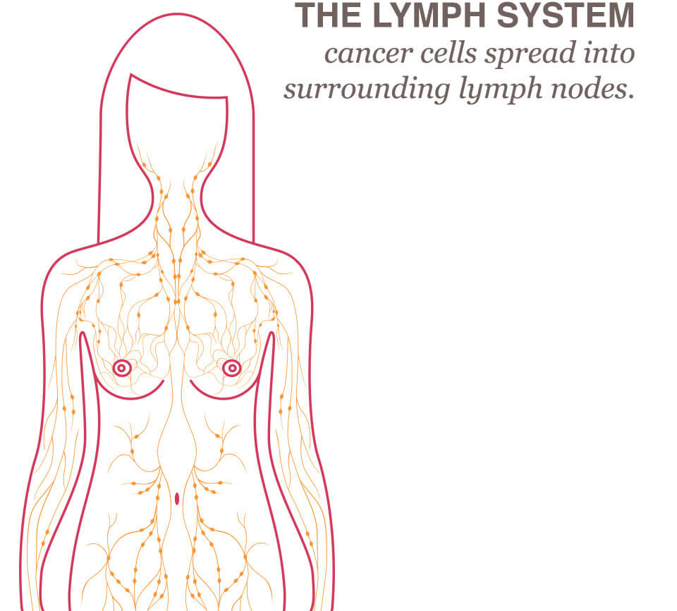 Although breast cancer is not easily controlled, the spread of breast cancer is sometimes predictable. The cancer cells spread through a customary path, out from the tumor and into the surrounding lymph nodes, before they progress throughout the body.
